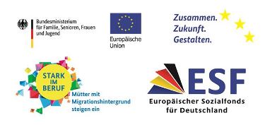 Das Projekt „MIA“ wird im Rahmen des Programms „Stark im Beruf – Mütter mit Migrationshintergrund steigen ein“ durch das Bundesministerium für Familie, Senioren, Frauen und Jugend und den Europäischen Sozialfonds gefördert. Die Teilnahme ist daher kostenlos.