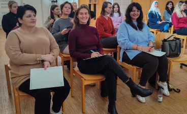 Manuela Bauroth, stellvertretende Pflegedienstleiterin des Klinkums, und Caroline Teichner, Bereich Bau und Investition, stellten in einer ausführlichen Präsentation das Klinikum vor. Die Klasse von Deutschlehrer Serdar Firtina erhielt Informationen über die Größe und Struktur des Unternehmens, in welche Richtung es sich künftig entwickeln möchte und – für die Lernenden besonders interessant – welche Jobs und Ausbildungsplätze es anbietet.