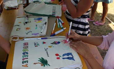 Für ein buntes und abwechslungsreiches Unterhaltungsprogramm sorgten zahlreiche Künstler*innen, Einrichtungen, Organisationen, Vereine und Parteien. Auch die Beruflichen Fortbildungszentren der Bayerischen Wirtschaft (bfz) Nürnberg waren mit einem Stand auf dem diesjährigen Muggeley dabei und hatten sich dafür eine ganz besondere Mitmachaktion überlegt: In den vorangegangenen Wochen hatten die Teilnehmer*innen des Gusto-Cafés am Standort eine große Zahl an nachhaltigen Turnbeuteln genäht. Diese wurden anschließend von Teilnehmer*innen weiterer Maßnahmen mit den Konturen des Muggeley-Schriftzuges bedruckt. Kleine (und große) Festgäste hatten schließlich am Stand der bfz die Möglichkeit, die Beutel kreativ zu bemalen und anschließend mit nach Hause zu nehmen. Die Aktion war ein voller Erfolg: Bereits zwei Stunden vor Ende der Veranstaltung waren alle 100 Beutel bemalt.