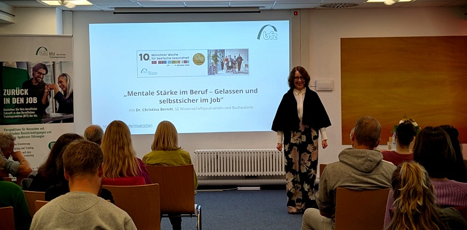 Passend zum Motto der Münchner Woche für Seelische Gesundheit „Gesunde Arbeit?“ bildete der Vortrag von Dr. Berndt den gelungenen Abschluss einer Reihe gut besuchter Veranstaltungen des BTZ München. Neben Online-Infoveranstaltungen, Rundgängen durch unsere Räumlichkeiten und Workshops zum Thema KI im Bewerbungsprozess konnten wir Interessentinnen, Netzwerkpartnerinnen, Firmenkunden und Auftraggeber umfassend über unser Angebot informieren.